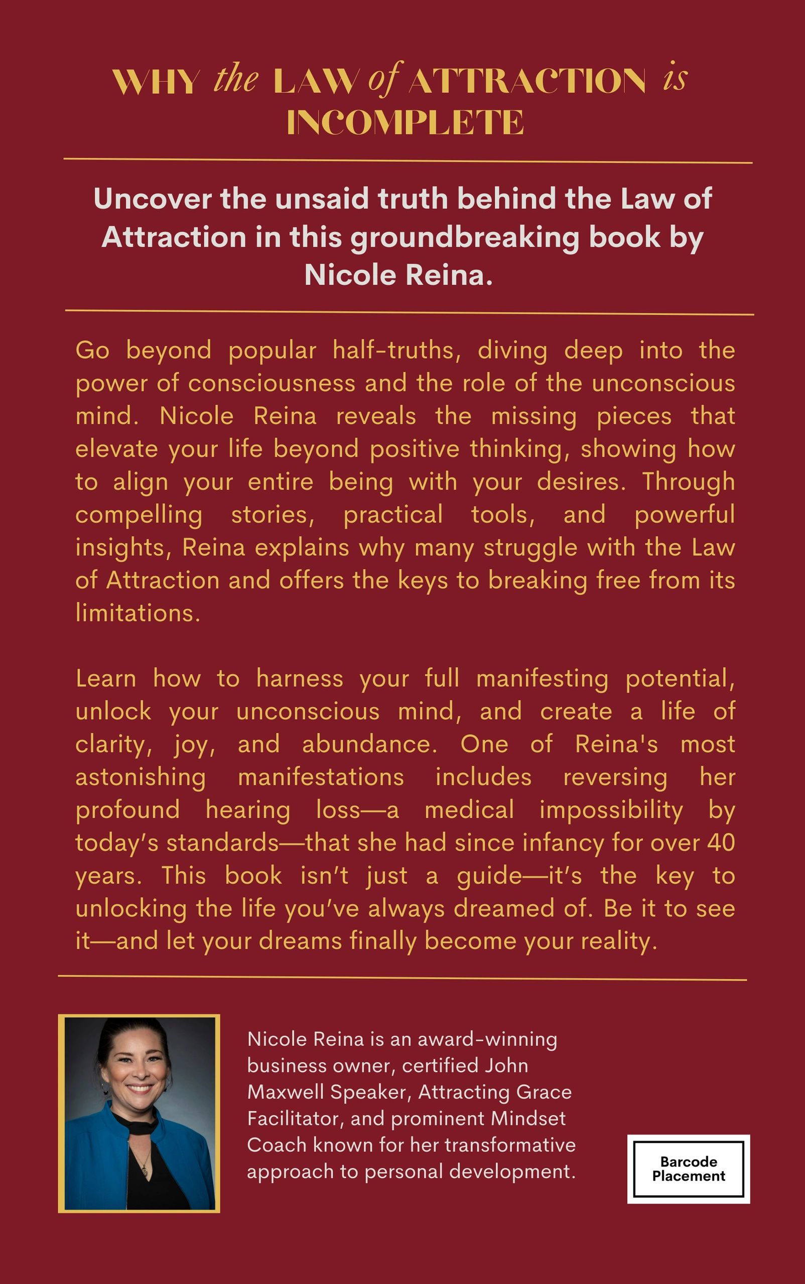 Have you ever wondered why the Law of Attraction does not always work the way you hoped? In The Law of Attraction is Incomplete, Nicole Reina invites you on an enlightening journey that reveals why manifestation often falls short and how your consciousness holds the missing key to unlock true, lasting transformation.